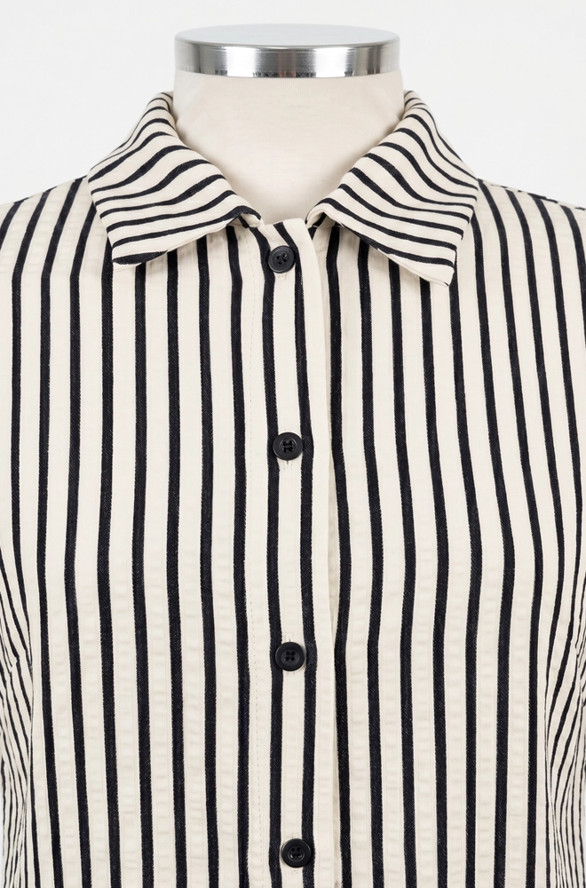 Camisa Lylu modelo Numa de rayas verticales en blanco roto y azul marino que parece negro.