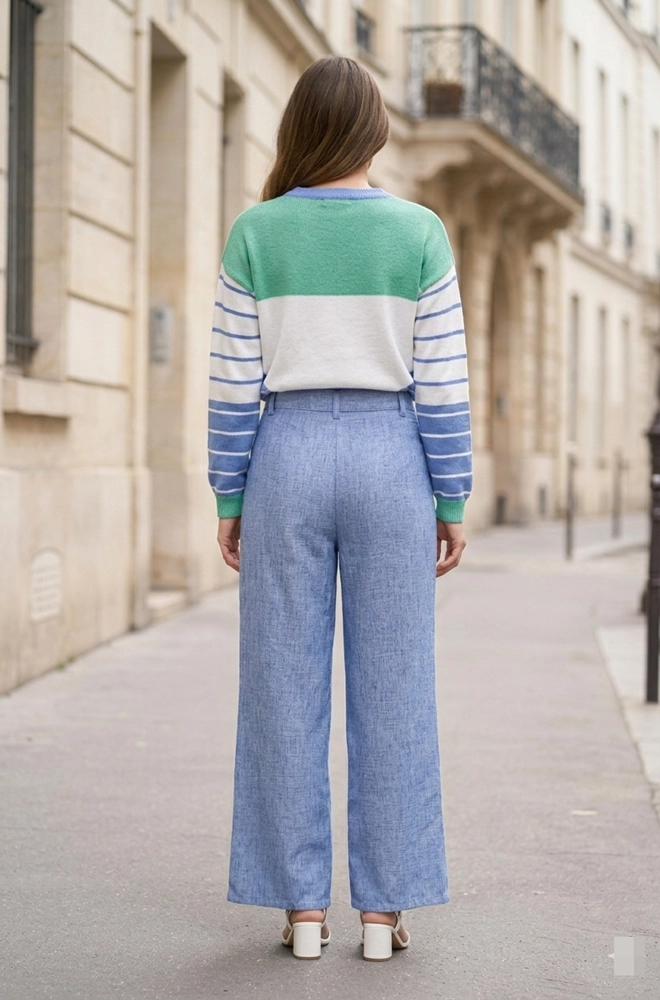 El diseño presenta tiro alto y perneras anchas, una silueta muy favorecedora que estiliza la figura y aporta un aire moderno al conjunto. El corte recto permite que el pantalón caiga con naturalidad, creando una línea elegante.