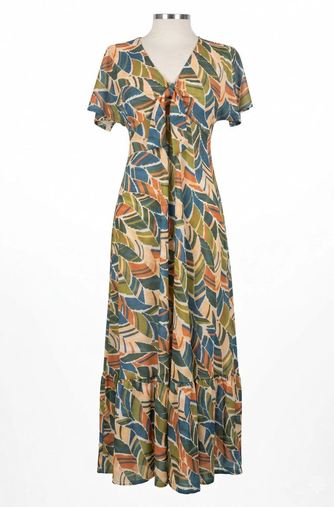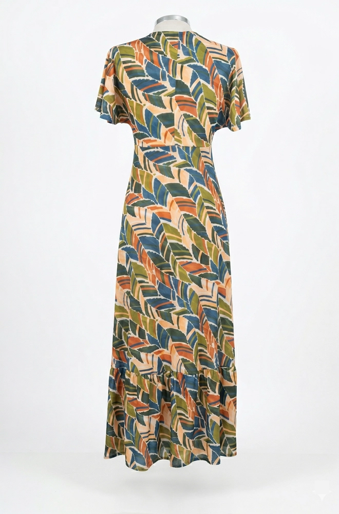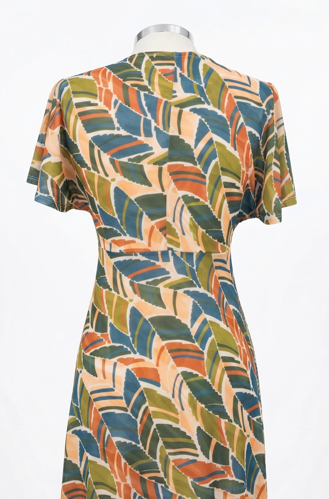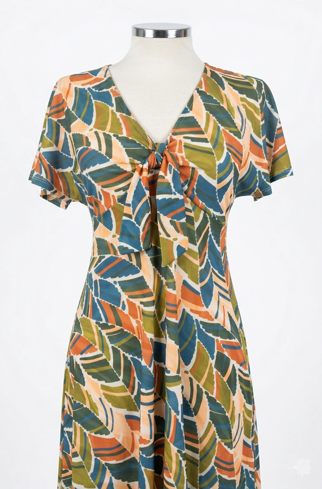 Su estampado de hojas multicolor, en tonos naranja, azul, verde oliva y beige, crea un look alegre, natural y muy fácil de combinar con distintos complementos.