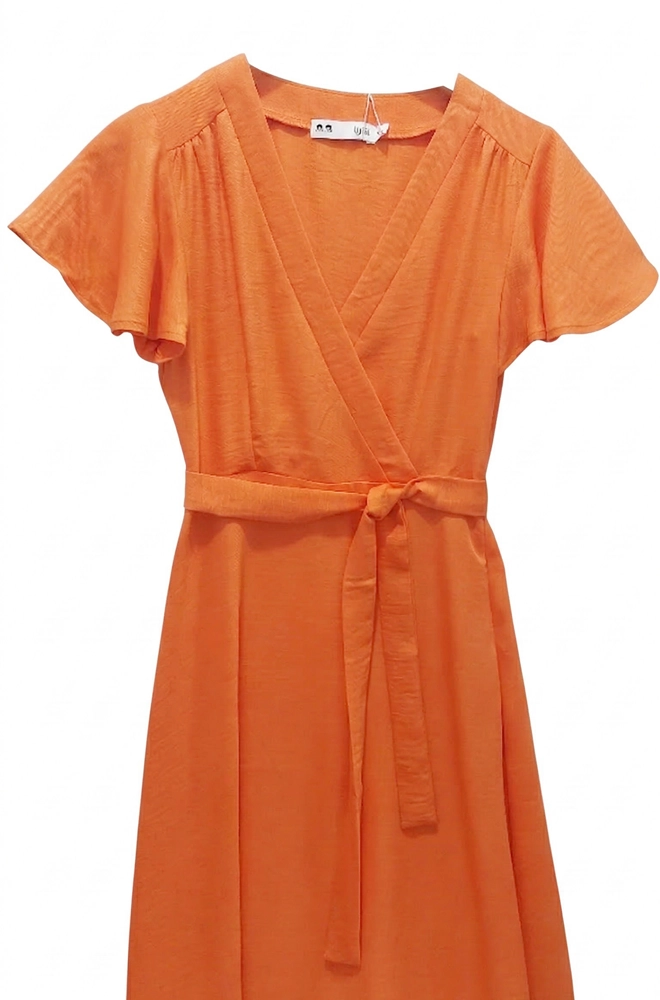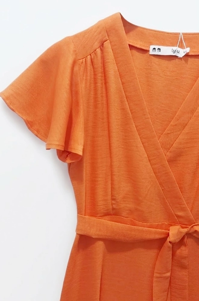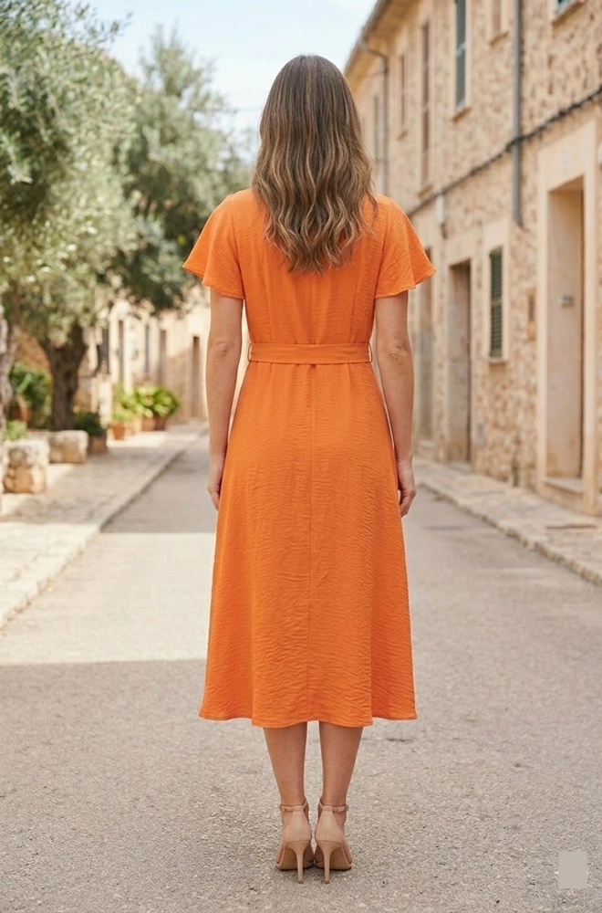 Está confeccionado en tejido ligero 100% poliéster, con una caída fluida que aporta movimiento al caminar. Su color naranja aporta luminosidad y personalidad al look, convirtiéndolo en una opción muy especial para diferentes momentos del día.