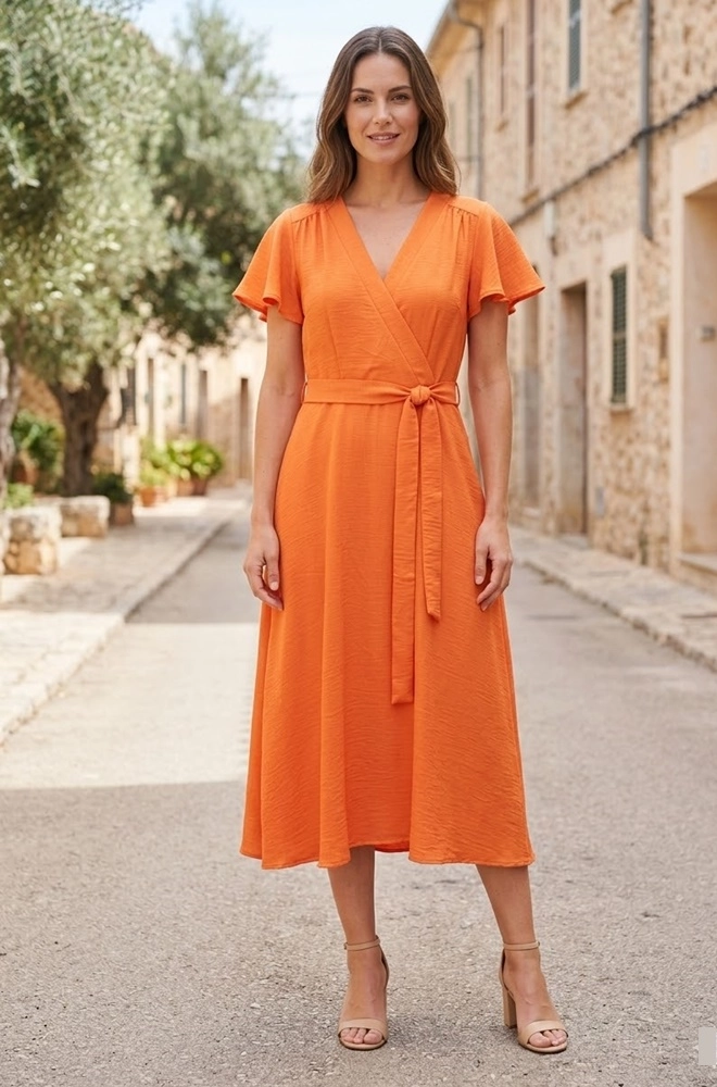 El diseño presenta un cuerpo cruzado con escote en V, un detalle muy favorecedor que estiliza la figura y realza la parte superior. En la cintura incorpora un corte que define la silueta, del que nace una falda con vuelo de largo por debajo de la rodilla, creando un movimiento elegante.