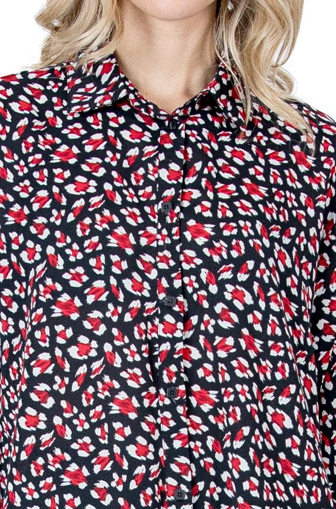 Camisa Caer de Lylu Wear en color negro con flores abstractas. Corte camisero oversize con caída fluida, parte trasera más larga y botones frontales.