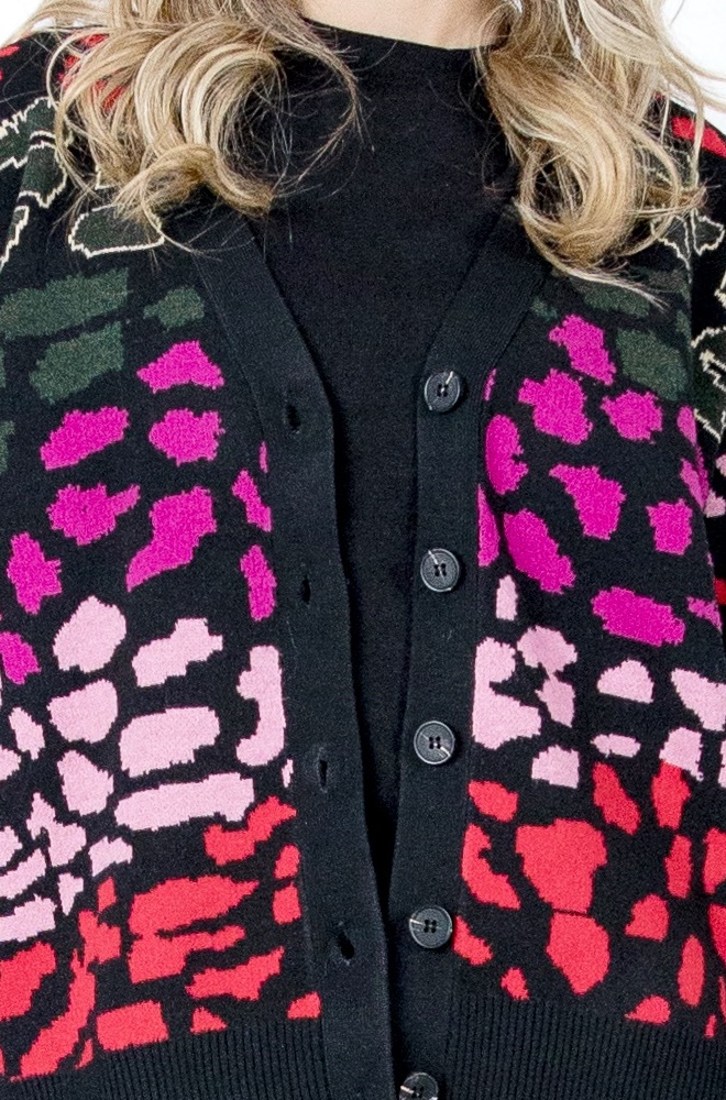 Cárdigan Cardy de Lylu Wear, punto suave en color negro con print multicolor. Corte recto, escote en pico y cierre con botones. Ideal para entretiempo.