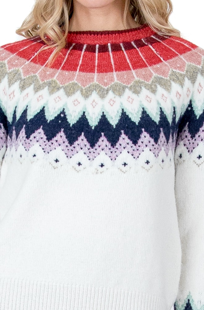 Su diseño destaca por el color blanco luminoso, perfecto para dar luz a los looks invernales, y por las grecas decorativas en la parte superior y en las mangas, que aportan un aire nórdico y acogedor. Estas grecas, en tonos suaves y combinaciones equilibradas, convierten al jersey Artemis en una prenda con personalidad, fácil de llevar y combinar.