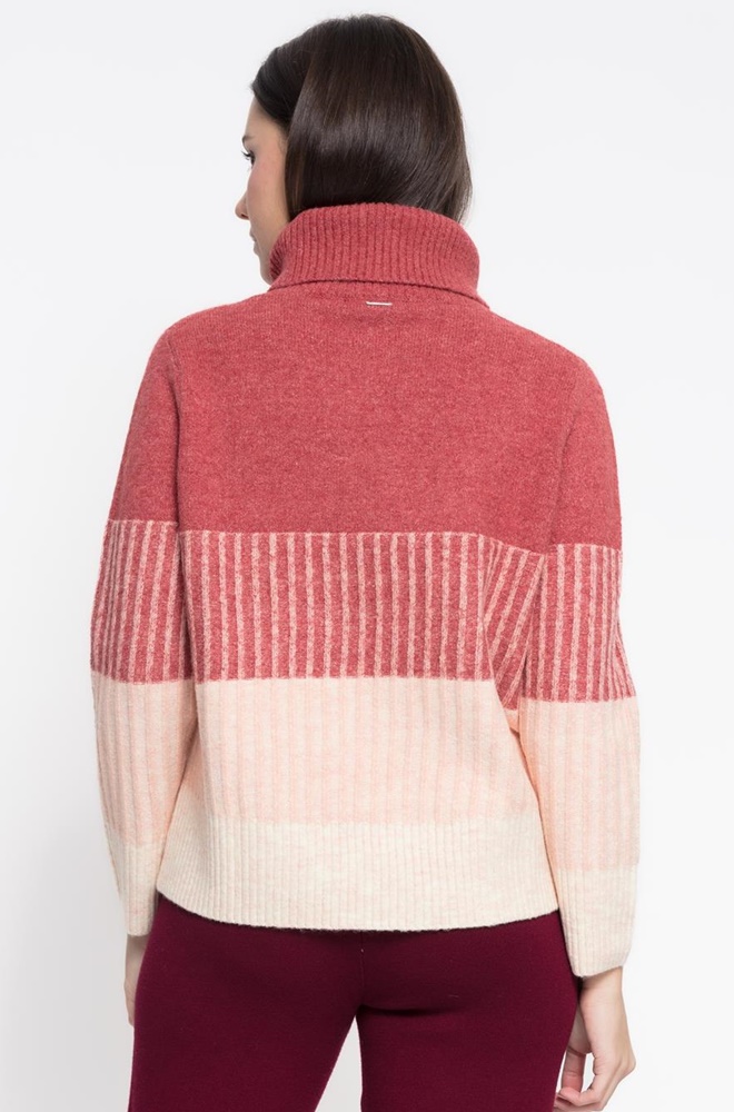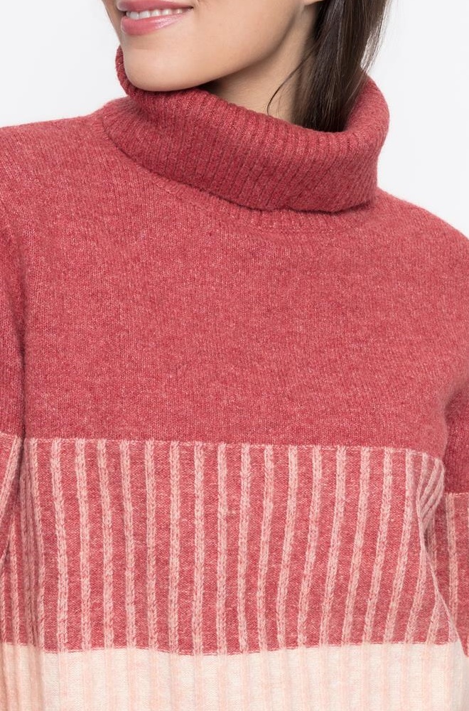 Jersey de punto Olivia de Cms Love. Corte recto, cuello cisne y tacto suave. Combina tonos burdeos y rosa con diseño a rayas. Cálido y cómodo.
