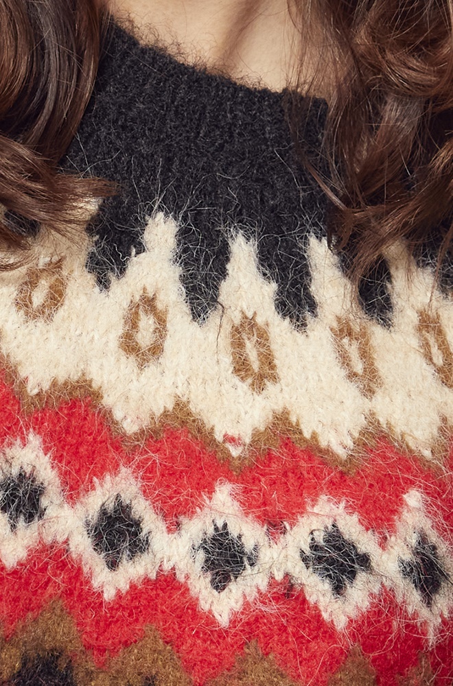 El Jersey Ilali de Lylu Wear está confeccionado en punto grueso y suave. En color rojo con greca geométrica en la parte superior y mangas, combina comodidad y estilo.