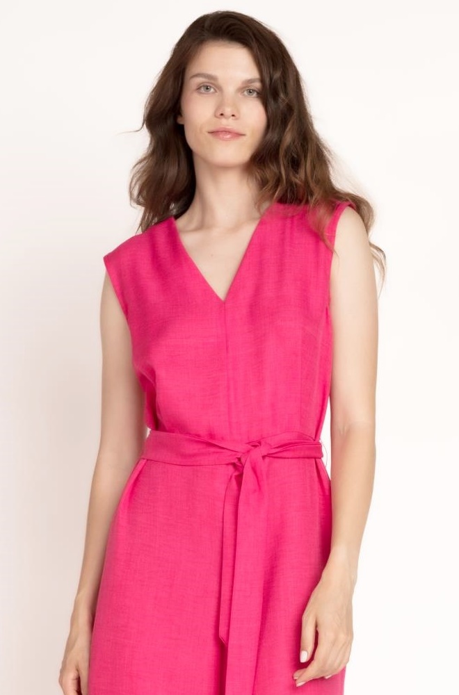 Destaca por su escote en pico, que realza el cuello y aporta un aire elegante sin necesidad de mangas. Su diseño sin mangas lo hace perfecto para los días más cálidos, pero también permite combinarlo con chaquetas o cárdigans para un look más versátil. Además, incorpora un cinturón del mismo tejido, ofreciendo la opción de ajustar la cintura para resaltar la silueta de una manera más femenina y definida.