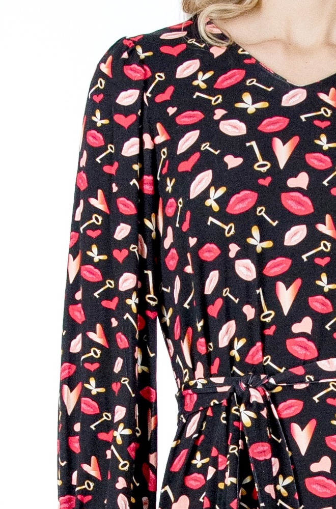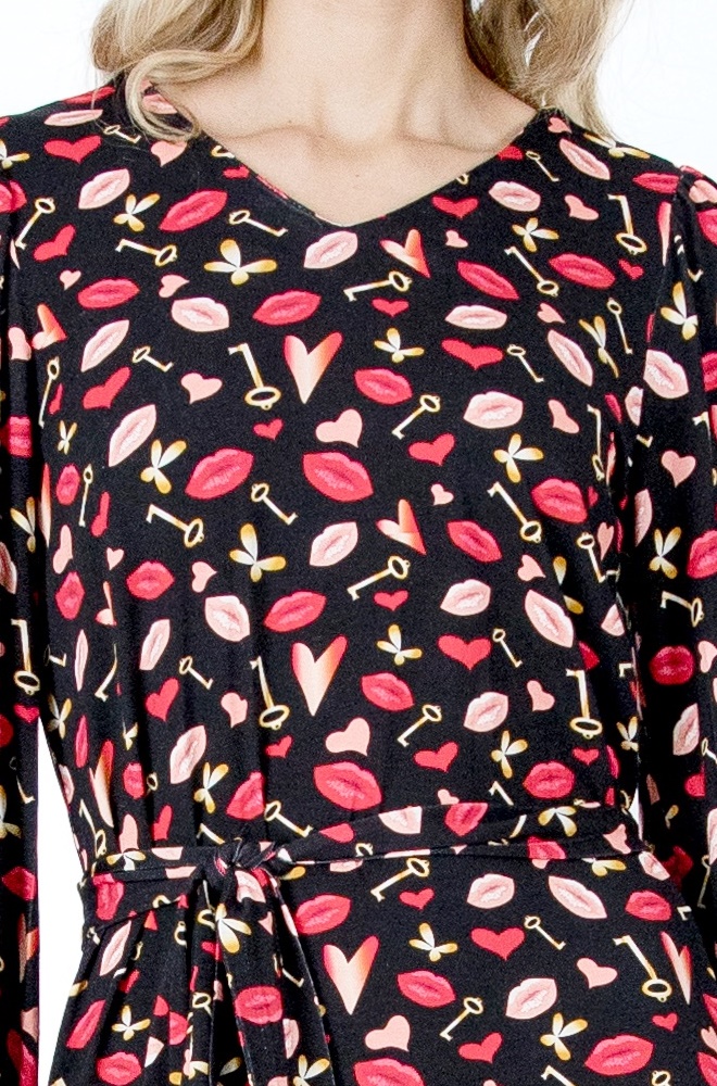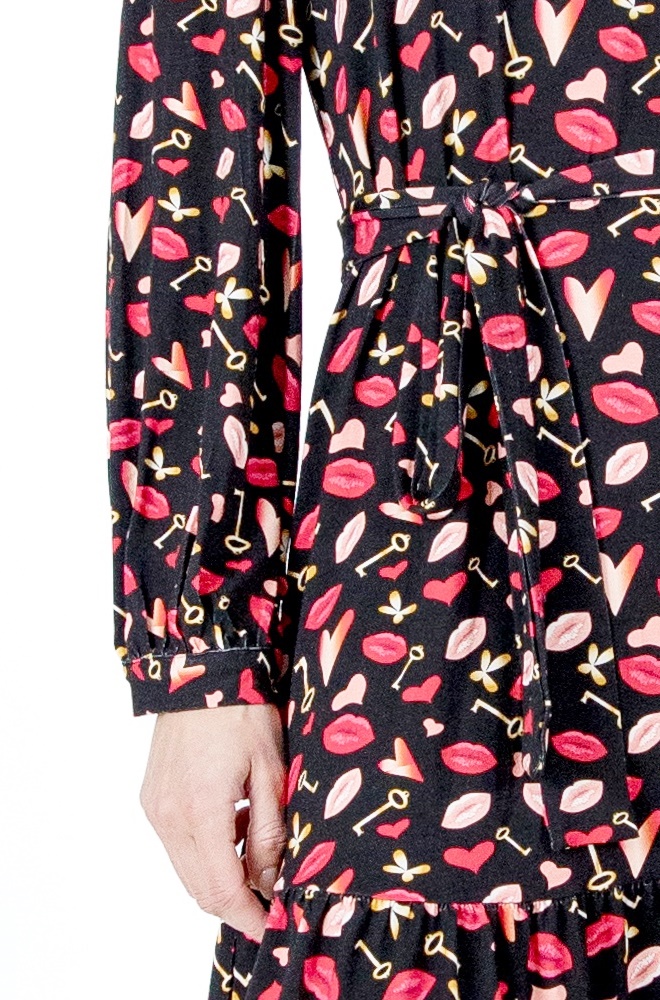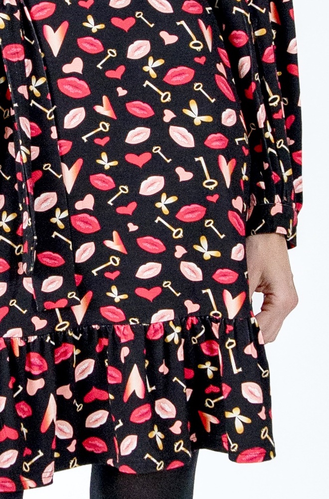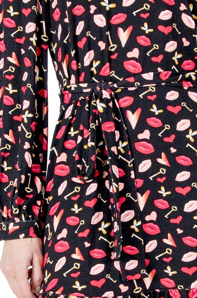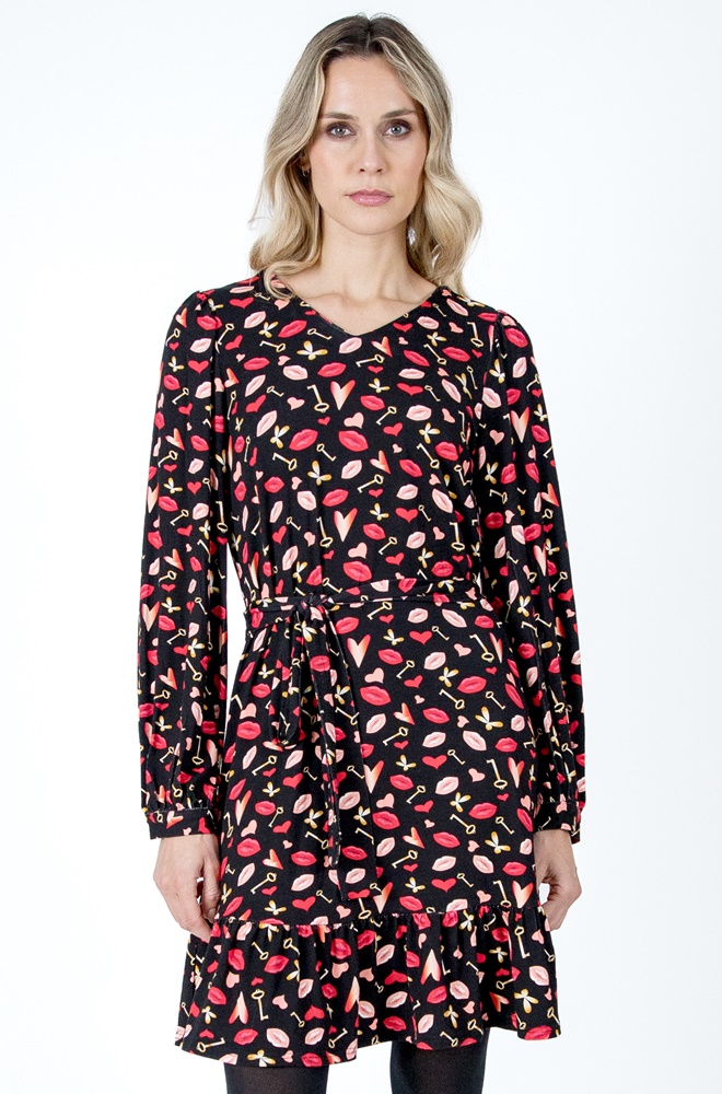 Este vestido Uzume de Lylu Wear negro con estampado divertido destaca por su corte evasé, que favorece a todo tipo de siluetas. La falda termina con un volante en la parte baja, aportando movimiento y un aire desenfadado al conjunto. El escote en pico estiliza el cuello y enmarca el rostro, mientras que el cinturón del mismo estampado y tejido te permite ceñir la cintura para marcar la silueta si lo prefieres.